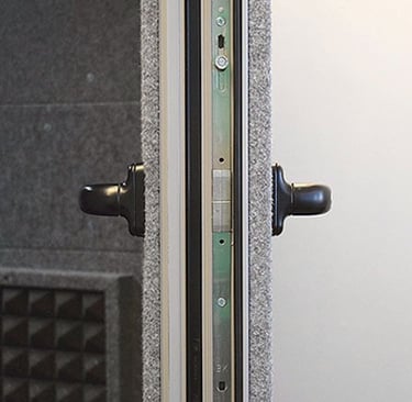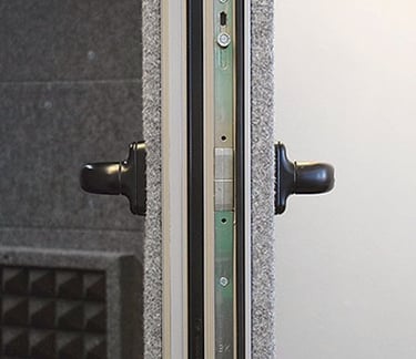 Puerta con perfilería de aluminio y cierre a presión multipunto. Compuesta de madera, materiales aislantes y materiales absorbentes recubiertos en fieltro.
