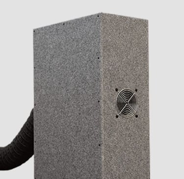 Renovación de aire forzada por extractor de conducto. Compuesta por dos silenciadores (entrada y salida de aire) y una caja de motor externa con manguera flexible de PVC.